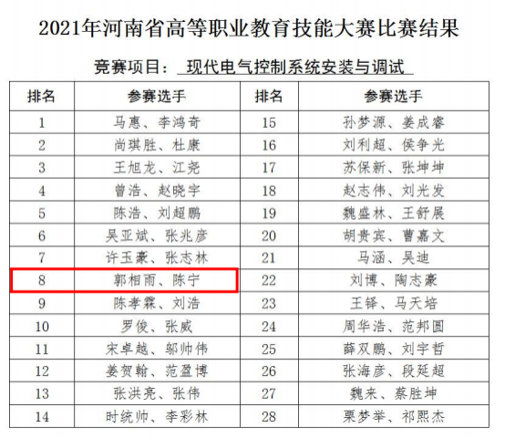 12 月 24 日,由河南省教育厅主办,黄河水利职业技术学院承办的 2021 年河南省高等职业教育技能大赛“现代电气控制系统安装与调试”赛项成功举行,我校代表队荣获团体二等奖。