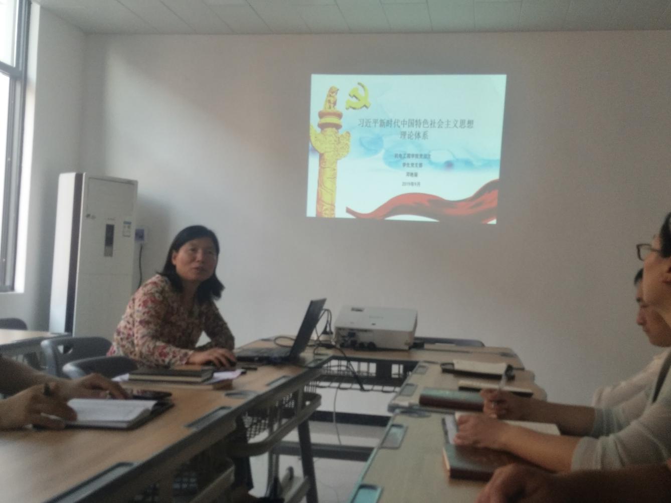 2019年9月25日下午,机电党总支学生党支部书记邓艳丽同志在党员活动室A212为学生党支部党员上了一堂主题为《习近平新时代中国特色社会主义思想理论体系》的党课。
