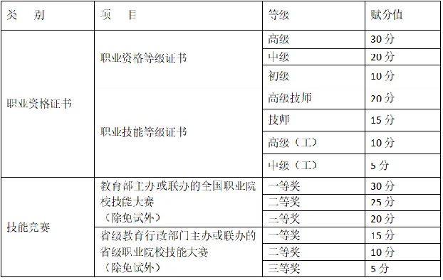 四、学生如提供有多个符合要求的职业资格证书或多个技能竞赛获奖项目,则分别取其中一个最高级别的证书或获奖项目予以赋分。
