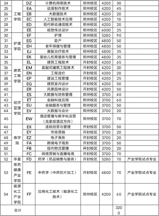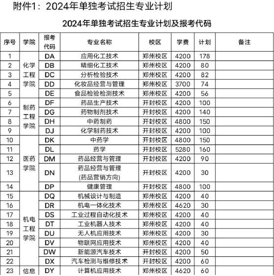 开封校区:药品生产技术、药物制剂技术、中药制药、化学制药技术、中药学、药学、药品经营与管理、药品经营与管理(药品营销方向)、健康管理、新能源汽车技术、汽车检测与维修技术、建筑工程技术、装配式建筑工程技术、工程造价、建设工程管理、建筑室内设计、风景园林设计、连锁经营与管理、市场营销、电子商务、跨境电子商务、现代物流管理、网络营销与直播电商、药学(药品销售与服务方向)、中药学(中药饮片加工方向)